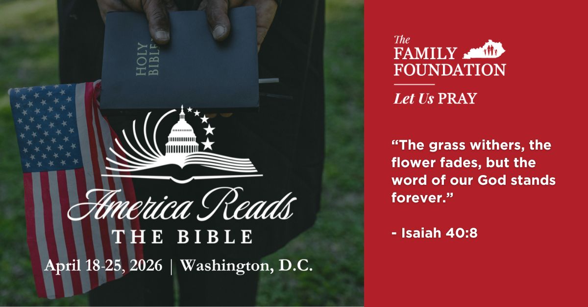 America has a chance to experience this type of revival as well. On April 18-25, 2026, the largest public reading of God’s Word in American history will take place, live, from the Museum of the Bible in Washington, D.C., and will be broadcast across the whole nation. The entire Bible will be read aloud by hundreds of ministry leaders and pastors, elected officials, and highly influential voices across our nation, including Franklin Graham, Candace Cameron Bure, David Barton, Sec. Mike Pompeo, Gov. Sarah Huckabee Sanders, Eric Metaxas, and more than 400 others. The Family Foundation is blessed to be a sponsor of the event and will be leading a special delegation of leaders from Kentucky.